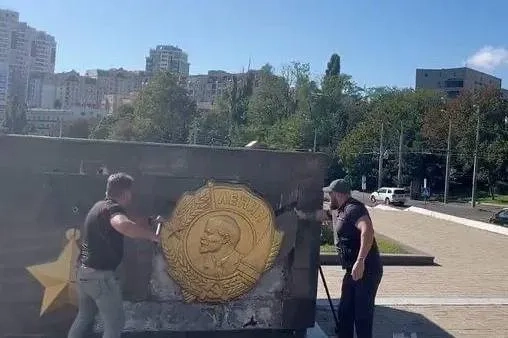 Демонтаж советских символов со стелы «Крылья победы» в Одессе. Видео © Telegram / Политика страны