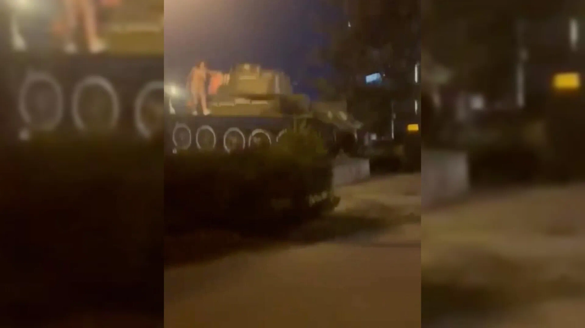 Вандалку достают с танка. Видео © Telegram / SHOT