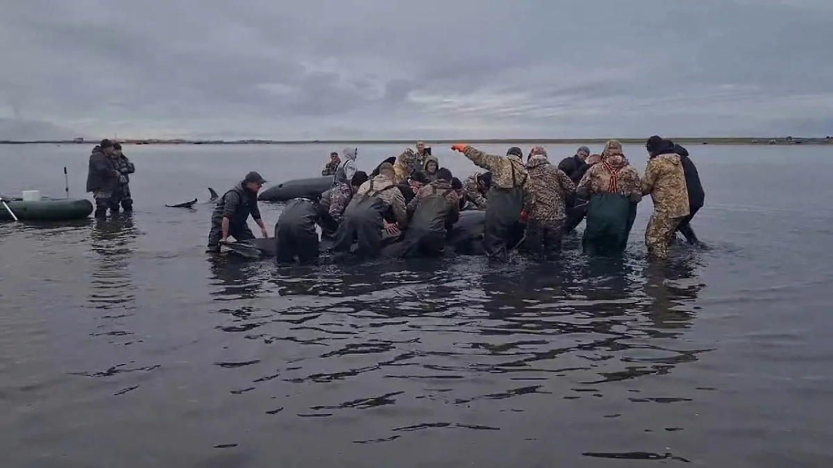 Напомним, стая косаток оказалась застрявшей на мелководье в Камчатском крае. Чтобы уплыть в открытое море им пришлось ждать прилива. Более 30 человек провели несколько часов, стоя по пояс в воде и поливая млекопитающих, чтобы они не высохли.