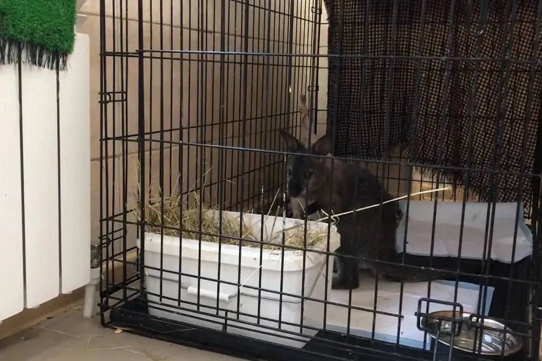 Спасённый от похитителя-карлика кенгурёнок отошёл от шока и уже уминает сено