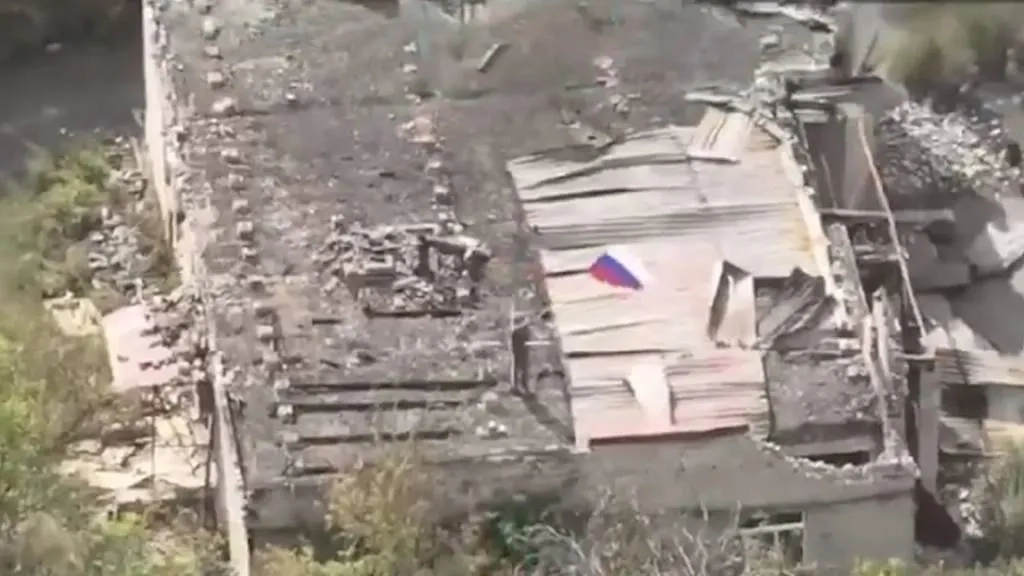 В ролике видно, как российский боец поднимает флаг России, стоя на крыше двухэтажного здания. Запись сделана с дрона, который также снял панораму. Видно, что в районе продолжаются бои — неподалёку от места событий в небо поднимаются столбы дыма.
