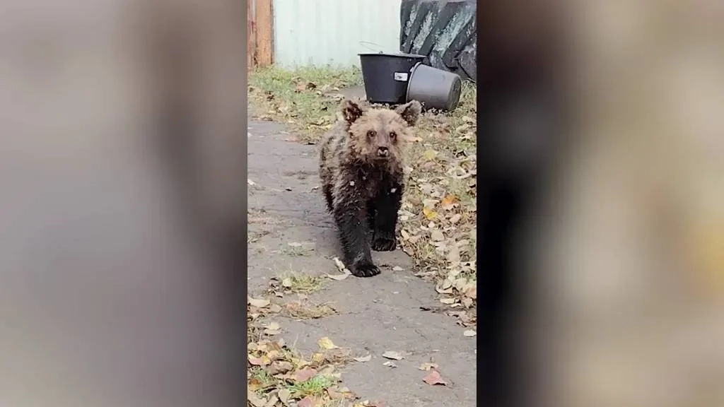В село в Пензенской области забрёл истощённый медвежонок. Видео © VK / Минлесхоз Пензенской области