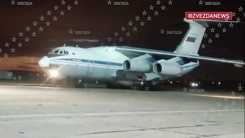 Транспортник Ил-76 с российскими военнослужащими на аэродроме Чкаловский. Видео © Телеканал «Звезда»