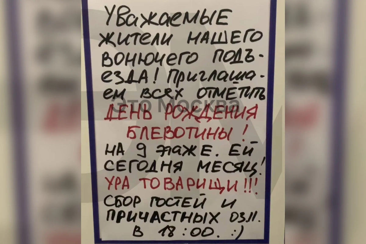 «Уважаемые жители нашего вонючего подъезда! Приглашаем всех отметить день рождения блевотины! На 9-м этаже. Ей сегодня месяц! Ура товарищи!!! Сбор гостей и причастных в 18:00», — гласит объявление.