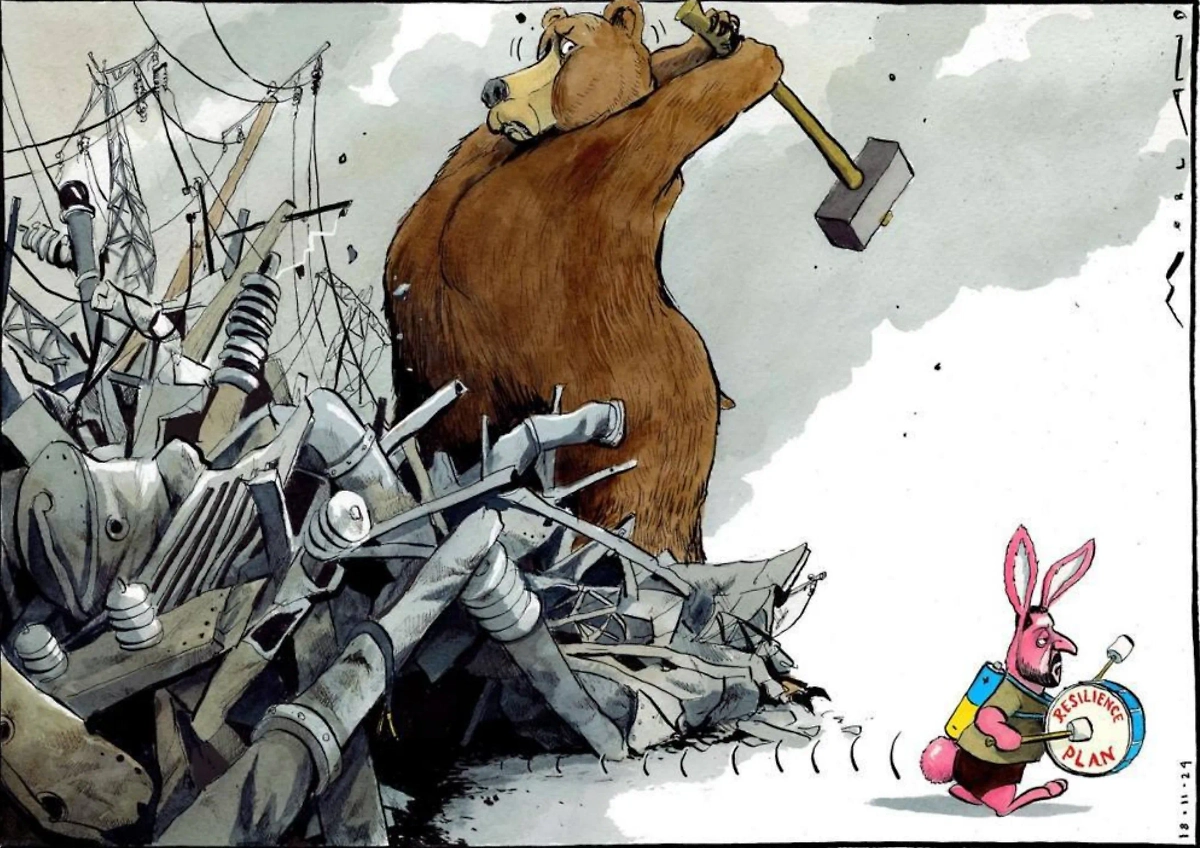 А вот на заднем фоне бурый мишка громит кувалдой украинскую энергосистему. От неё остались одни обломки и торчащие железки с проводками. Пользователи оценили юмор автора и написали в комментариях, что попадание в ситуацию 100%-ное.