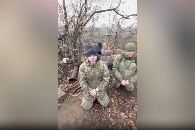 По словам бойца ВСУ слева, услышав звук техники, он вылез из блиндажа, чтоб посмотреть, что вокруг творится. Снаружи уже шёл яростный бой, поэтому солдат зашёл назад, взял в охапку Серёгу (справа) и приготовился к худшему. Их начали обстреливать, но огонь утих, а они использовали эту возможность, чтобы выйти и сдаться ВС РФ.