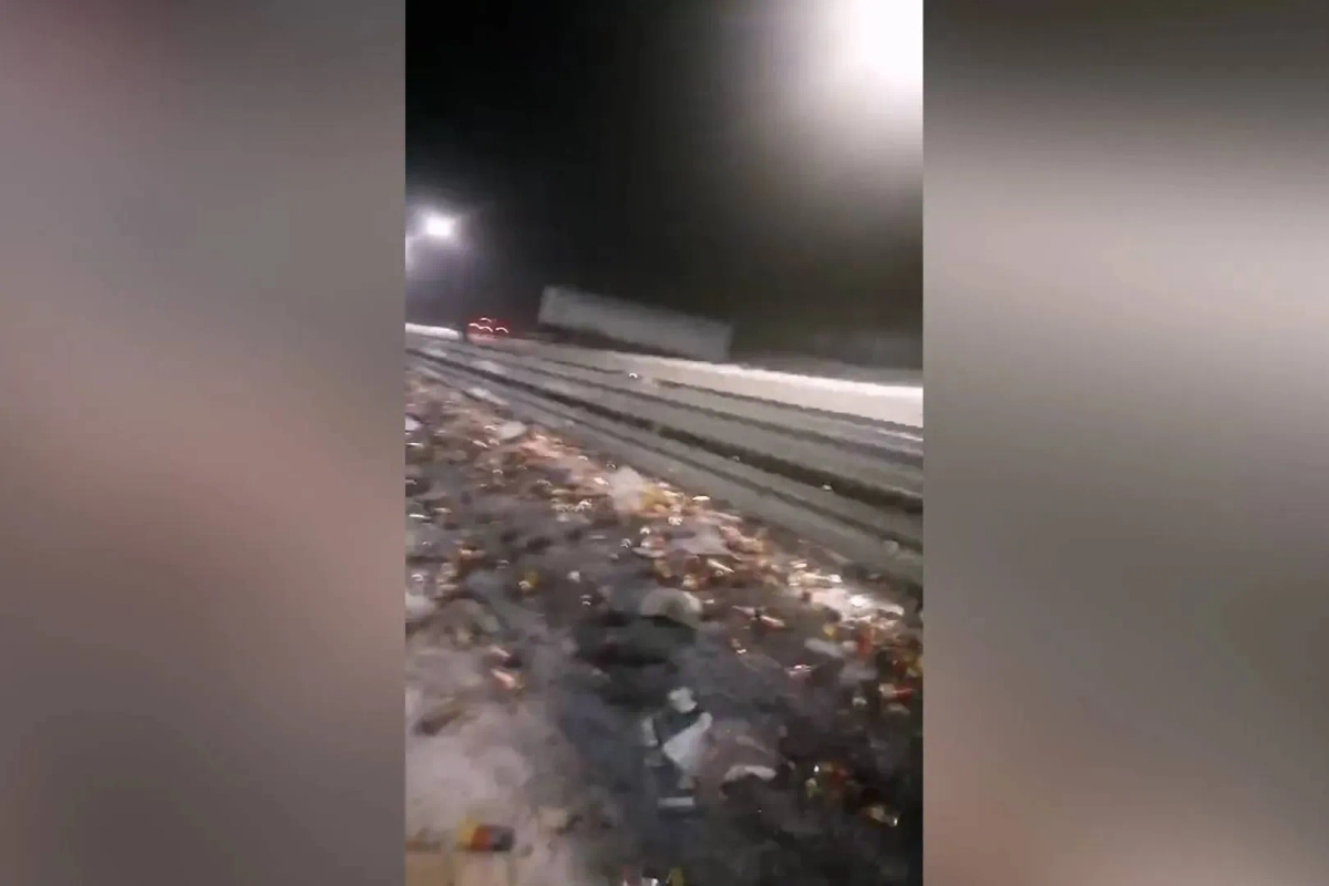 SHOT: Фура с алкоголем улетела в кювет в Башкирии, усыпав трассу пивом