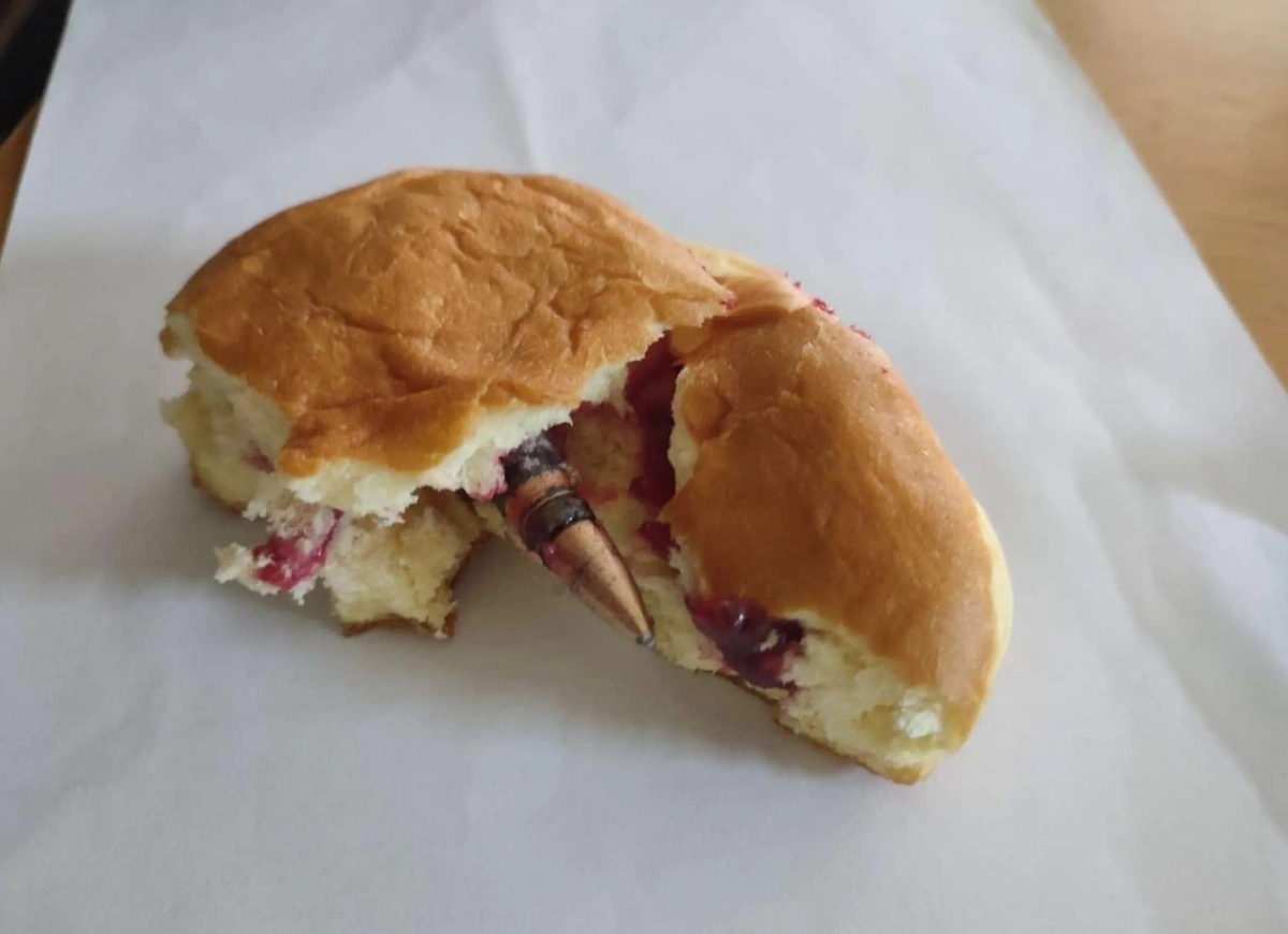 Мэр Ивано-Франковска Руслан Марцинкив поделился у себя в соцсетях снимком пончика, в котором нашли патрон. Он отметил, что фото прислали жители, однако усомнился в подлинности снаряда. Глава города добавил, что производитель не из местных, однако «замылил» на фото упаковку, поэтому происхождение «боевого десерта» остаётся в секрете.
