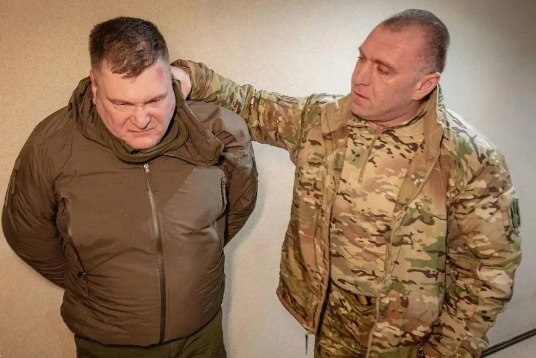 Появилось фото с руководителем штаба Антитеррористического центра СБУ, которого лично задержал глава украинской спецслужбы Василий Малюк*. Его имя по-прежнему не раскрывается. На фотографиях, опубликованных пресс-службой СБУ, изображён мужчина, которого Малюк* держит за шею.