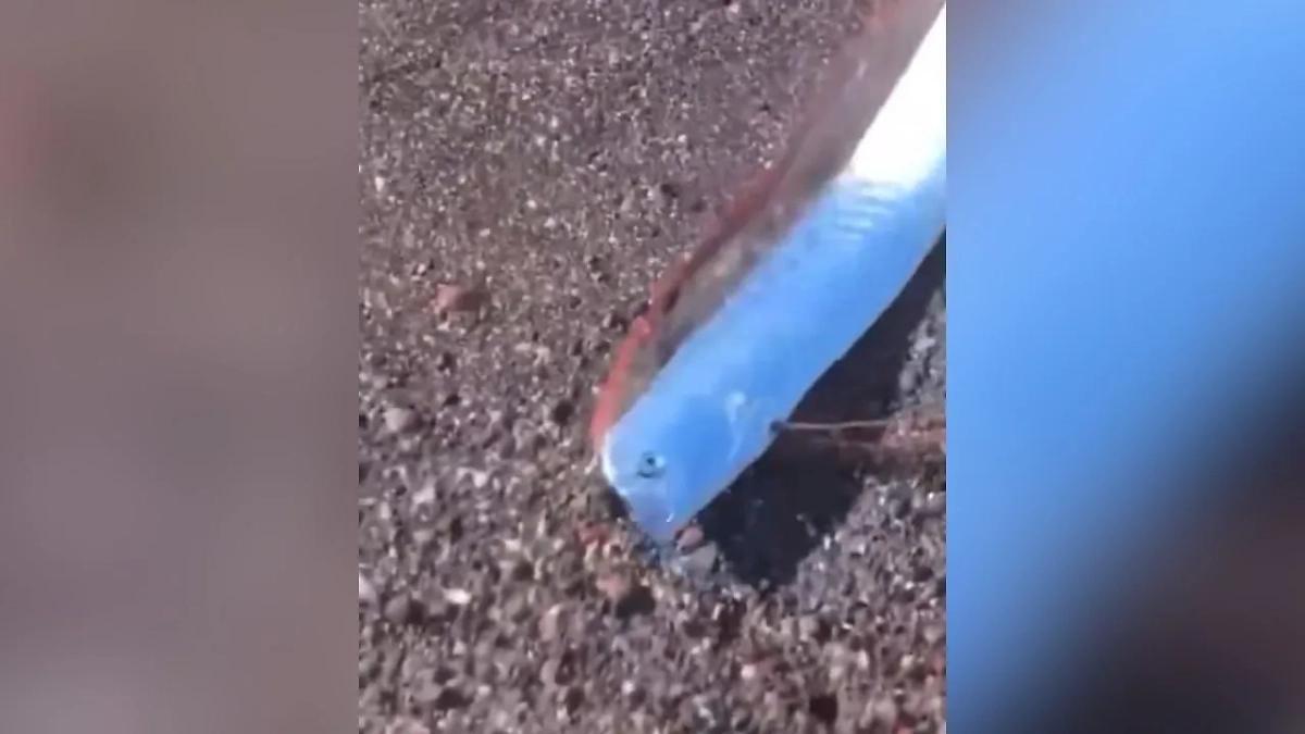 Небольшую особь увидели отдыхающие, когда ту выбросило на мелководье. Сначала сельдяного короля запечатлели на видео, а затем один из смельчаков запустил морского обитателя обратно в воду.
