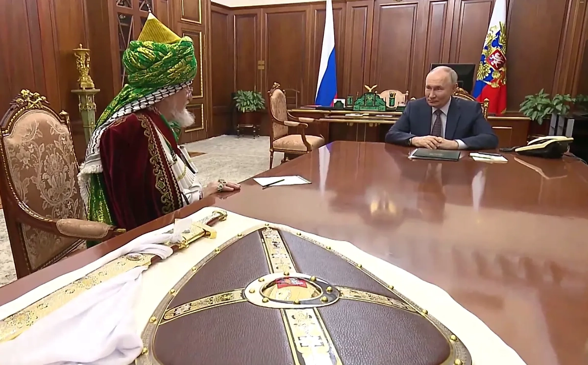 Глава Центрального духовного управления мусульман России, верховный муфтий Талгат Таджуддин подарил президенту РФ Владимиру Путину щит и меч защитника Отечества. Это произошло во время рабочей встречи в Кремле.