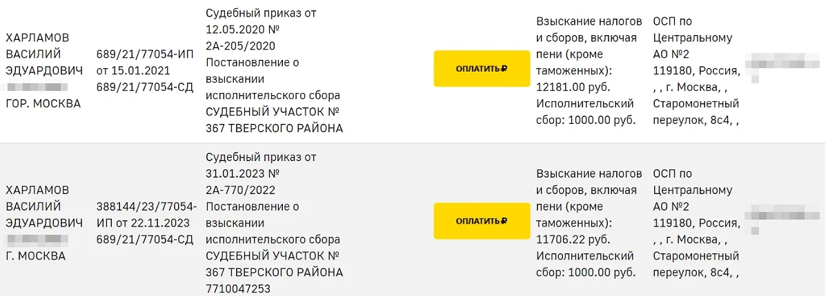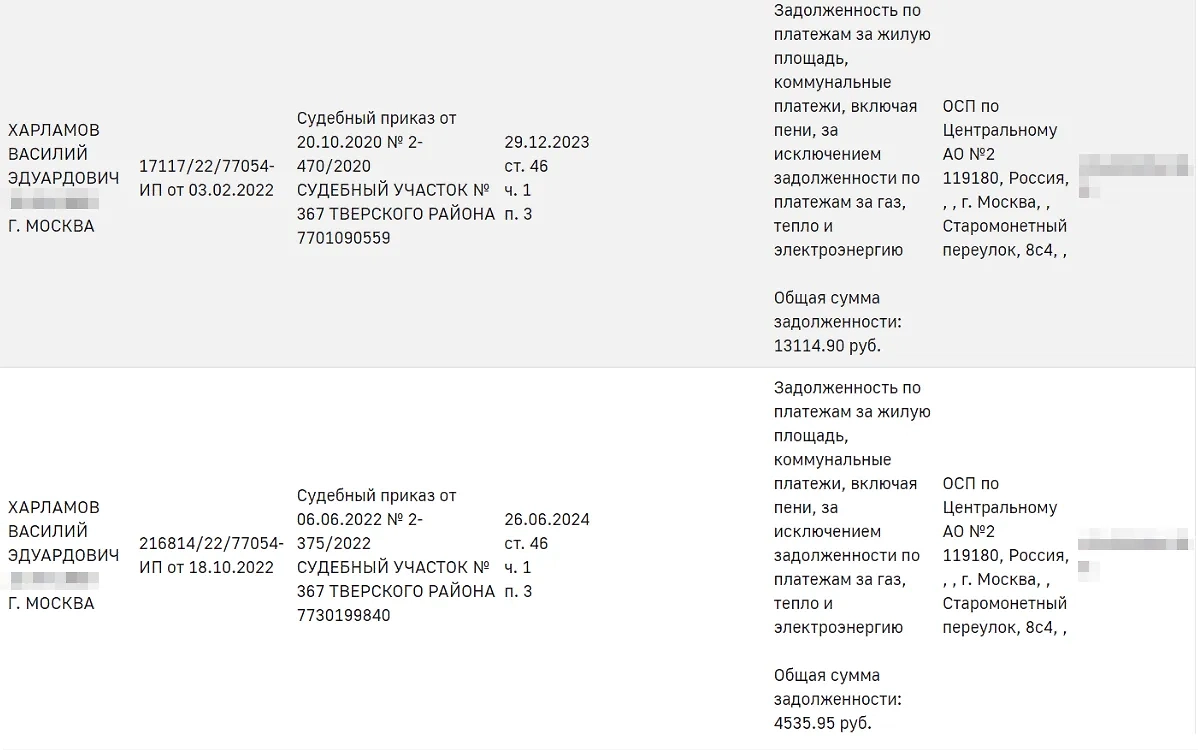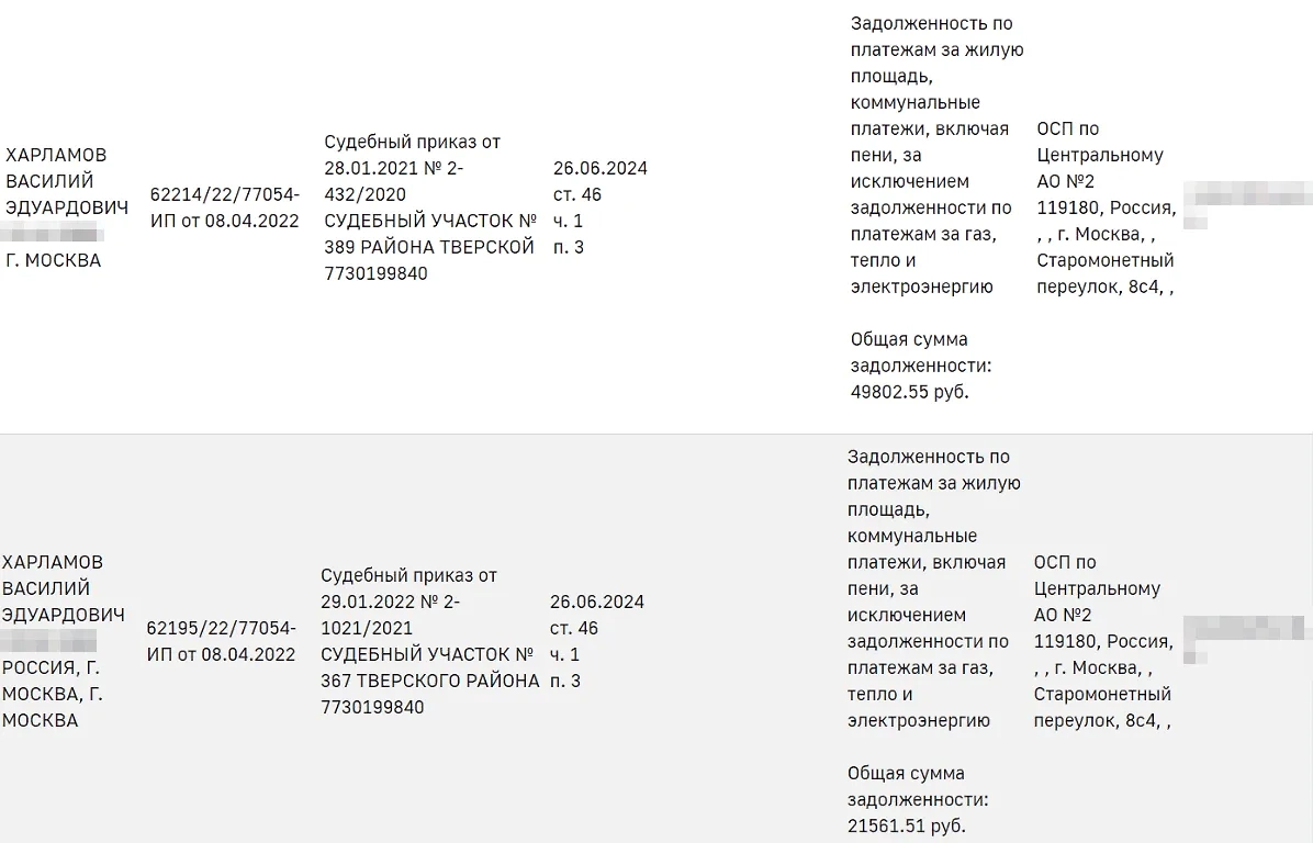 За её отцом Василием Харламовым, как видно, тоже тянутся долги и гоняются приставы. Он должен 2,6 млн рублей по кредитам, 141 тысячу за квартплату и 24 тысячи по налогам. Некоторым из этих долгов уже свыше пяти лет.