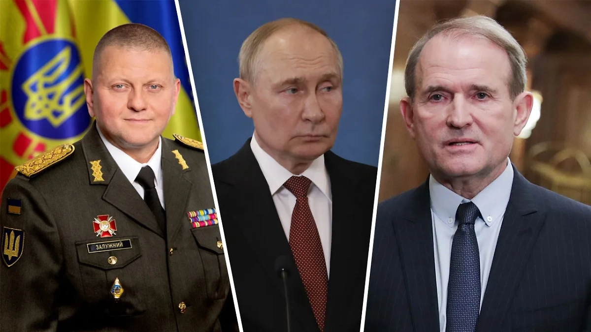 Валерий Залужный, Владимир Путин и Виктор Медведчук. Обложка © Life.ru / Wikipedia / Mil.gov.ua / Duma.gov.ru