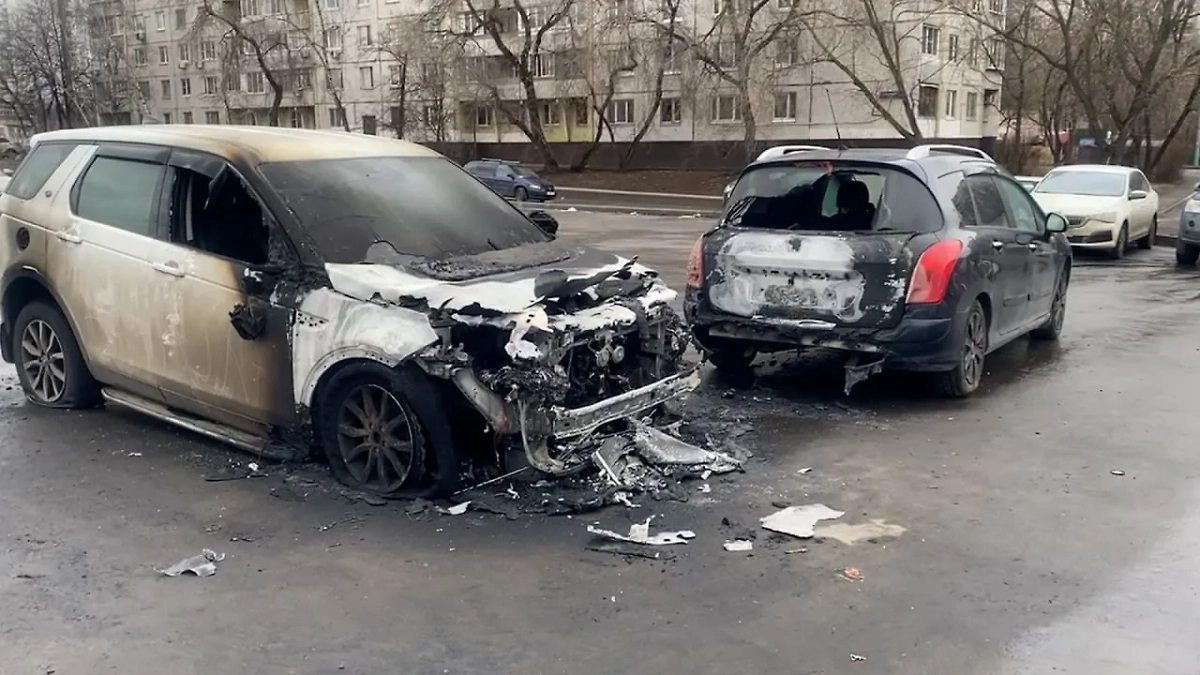 Сгоревшие автомобиль после поджога в Бибирево. Видео © SHOT