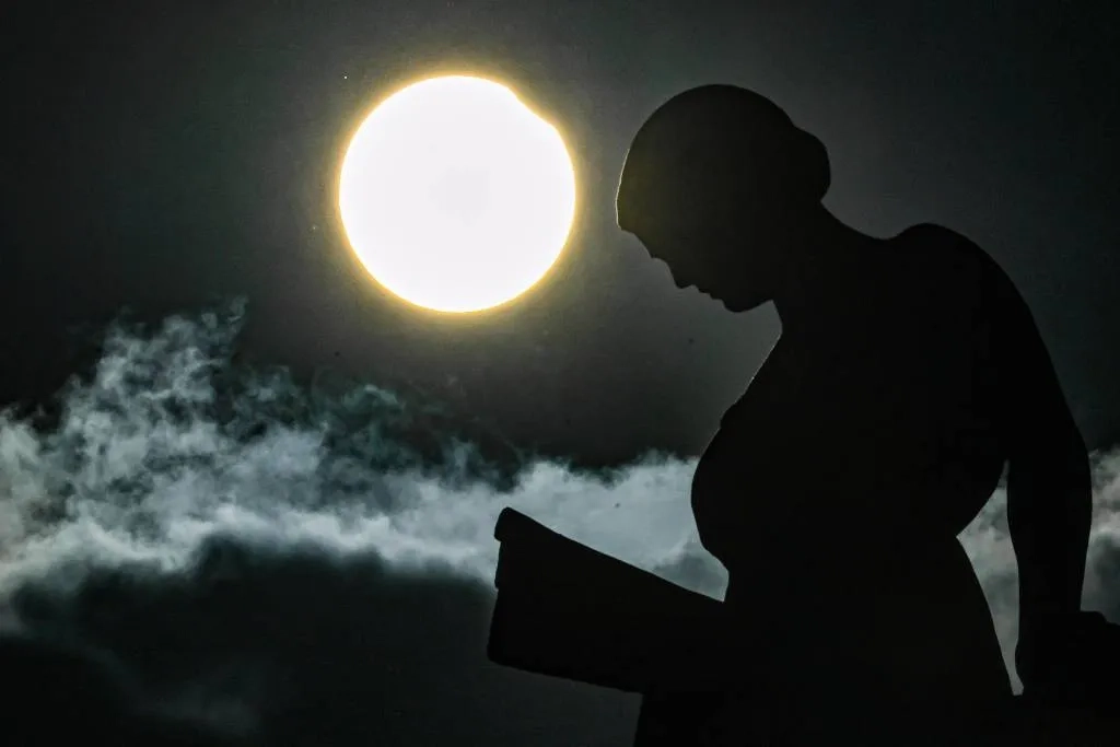 Частичное солнечное затмение на фоне скульптуры «Девушка с книгой» на крыше Российской государственной библиотеки в Москве. Обложка © ТАСС / Евгений Мессман