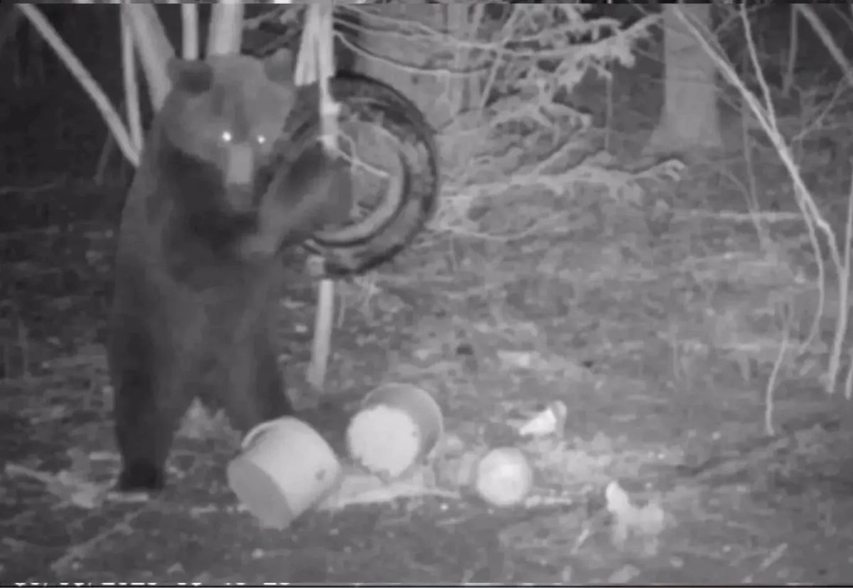 Оголодавший мишка почуял запах еды, который привёл его на площадку, где хранился провиант для кабанов. Медведь съел весь комбикорм и кукурузу из вёдер, а затем начал играть с подвешенной на дереве покрышкой. Поняв, что в игре с колесом победу ему не одержать, косолапый удалился.