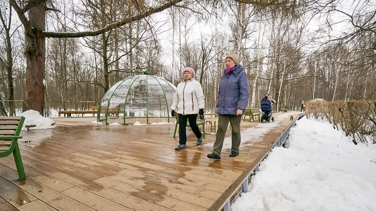 Почти по кромке Золотого пруда проходит пешеходная зона из экологического материала — гранотсева. Немного выше вместо старой дорожки из плитки положили эконастил, на котором разместили места для отдыха. Вдоль прогулочного маршрута смонтировано десять лавочек с урнами, восемь комплектов уличных кресел со столиками, девять лежаков, а также четыре прозрачные беседки-геокупола. Из последних открывается живописный обзор на 360 градусов на пейзажи парка, при этом отдыхающий защищён от непогоды. Всё это пространство соединили с обновлённой площадкой у бывшей насосной станции несколькими дорожками-настилами шириной около двух метров.