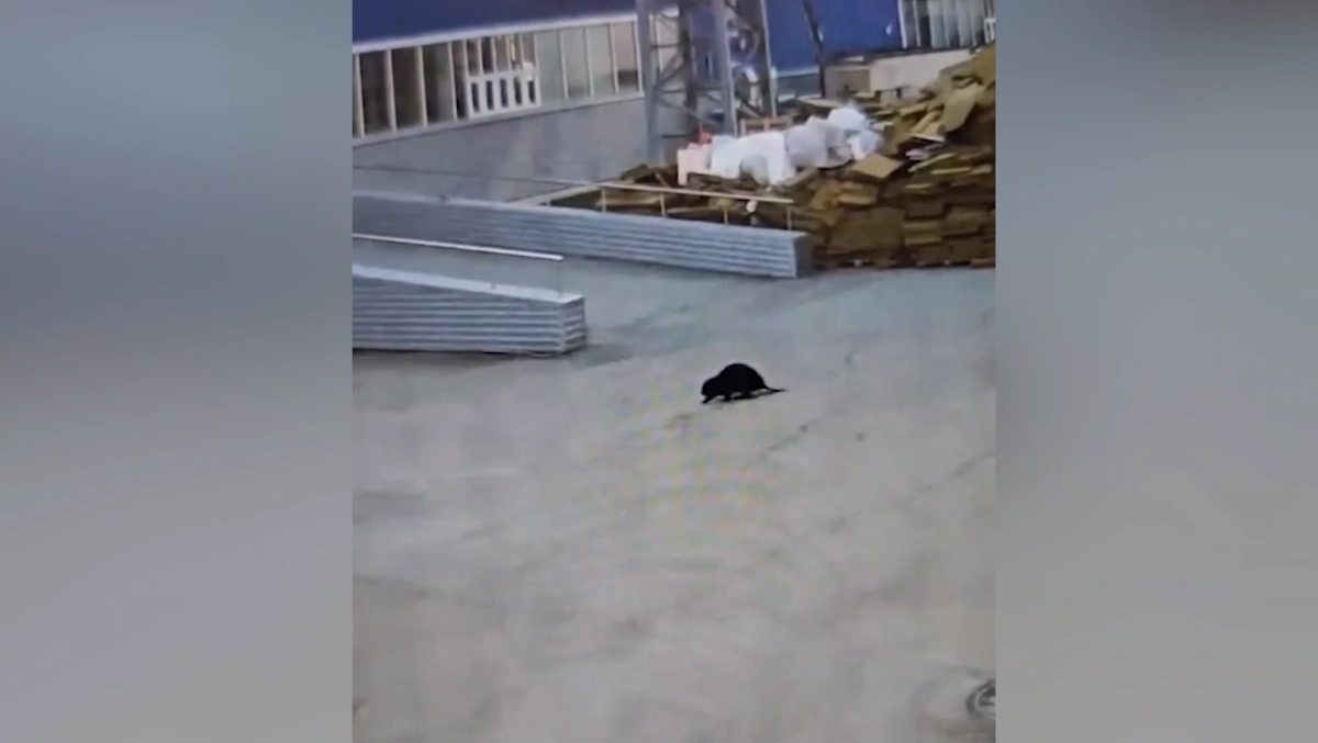 На кадрах видно, как бобёр вальяжно прохаживается среди строительных материалов, а затем осматривает зелёный газон возле лавочек.