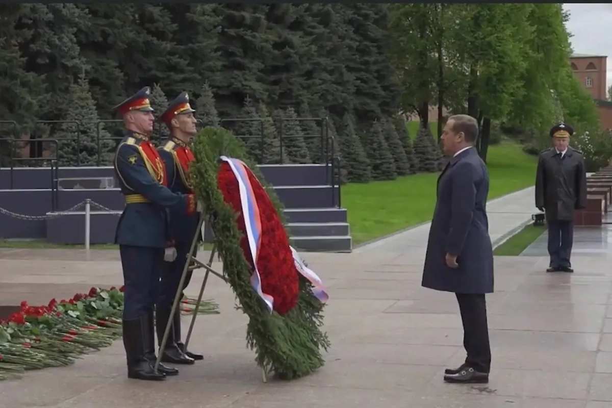 Зампред Совбеза России и лидер партии «Единая Россия» Дмитрий Медведев принял участие в церемонии возложения венка к Могиле Неизвестного Солдата, расположенной в Александровском саду у Кремля. Видеозапись опубликована на его личной странице в соцсети «ВКонтакте».