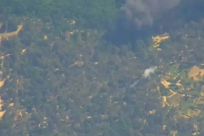 На видео зафиксировано попадание кассетной ракеты в лесной массив. После удара наблюдается возгорание.