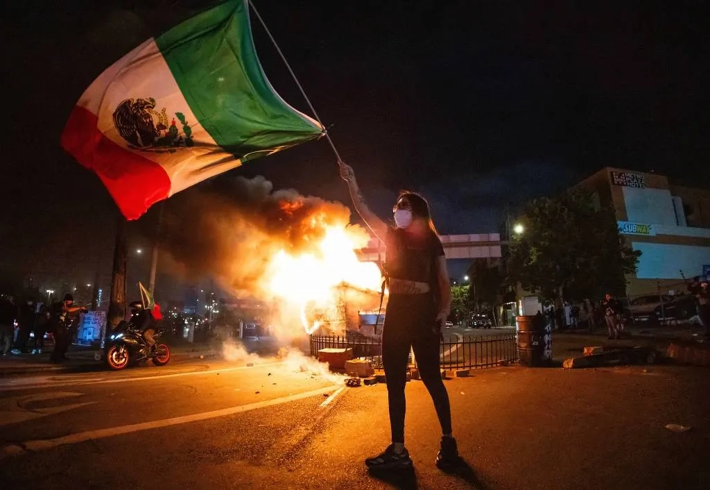Один из участников протестов, размахивая мексиканским флагом, взобрался на горящий автомобиль, в то время как другие бросали в огонь дорожные конусы, били в барабаны и выкрикивали лозунги против иммиграционных властей.