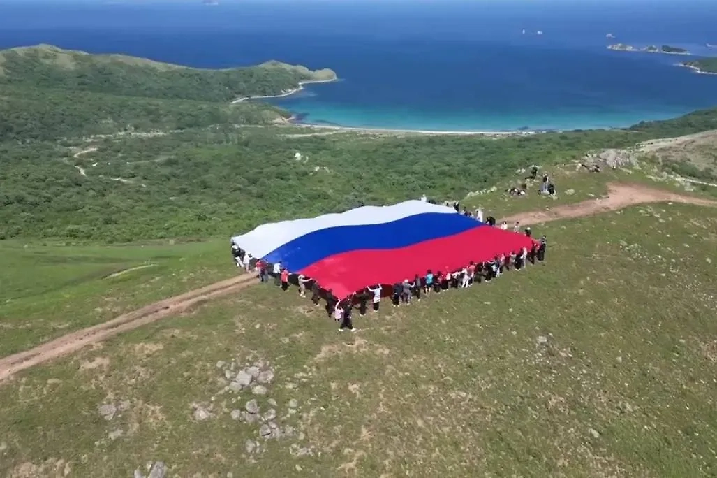 Участники акции по случаю Дня России развернули огромный триколор на острове Гамова в Приморье. Видео © Telegram / Молодёжь Приморья