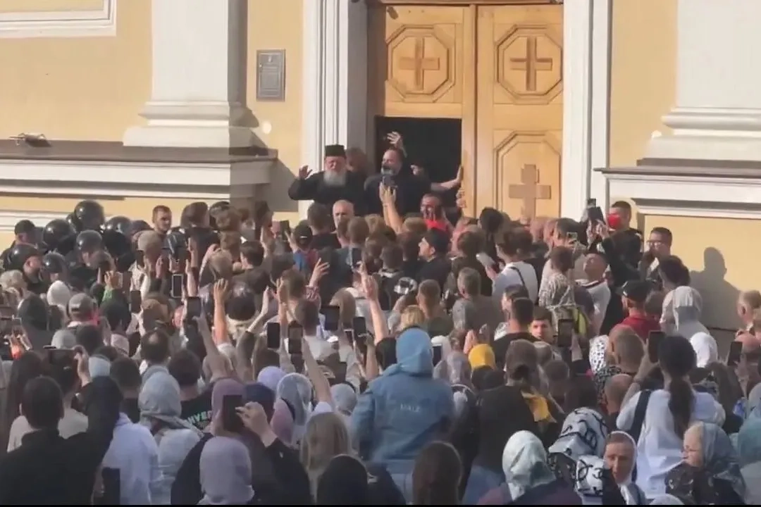 Перед входом стоит митрополит Мелетий и часть прихожан УПЦ МП вошли в храм в Черновцах на Украине. Видео © Х / ГЛАВКОМ