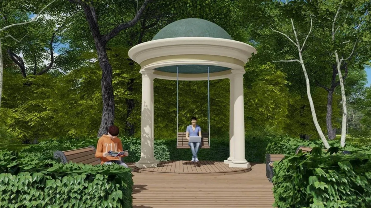 Главная задача благоустройства — сделать территорию доступной для жителей, предоставить им возможность комфортного отдыха и обеспечить максимальную сохранность уцелевших фрагментов планировочной структуры и садово-парковых элементов. Поэтому большую часть усадебной инфраструктуры расположат на эконастиле, в который интегрируют беседки для отдыха, лавочки, ротонду с подвесными качелями и площадку для проведения мероприятий.
