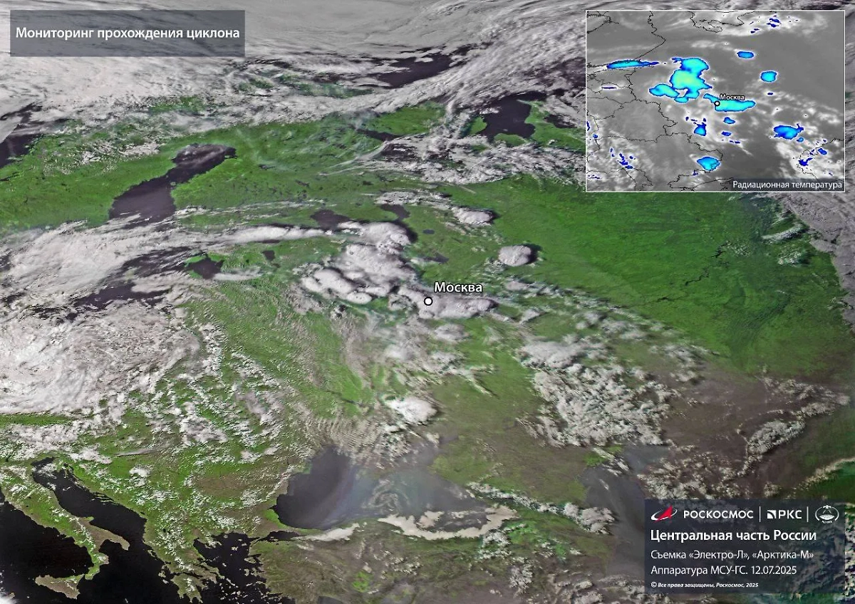 Как пояснили в «Роскосмосе», циклон, пришедший в столичный регион на фоне аномальной жары, вызвал обильные дожди и град. Снимки были получены с помощью космических аппаратов «Электро-Л» и «Арктика-М».