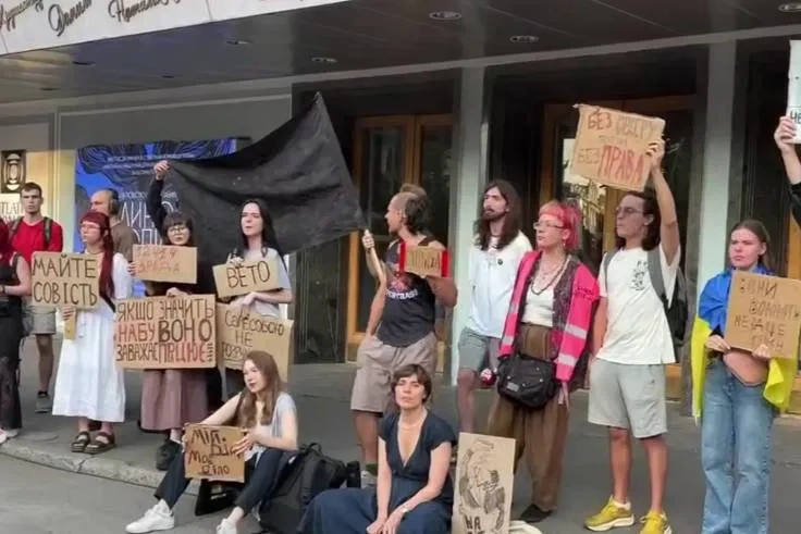 Как и в предыдущие дни, у театра Франко, находящегося недалеко от офиса Зеленского, вновь собрались протестующие. Участники скандируют лозунги «Коррупция убивает» и «Руки прочь от НАБУ и САП».