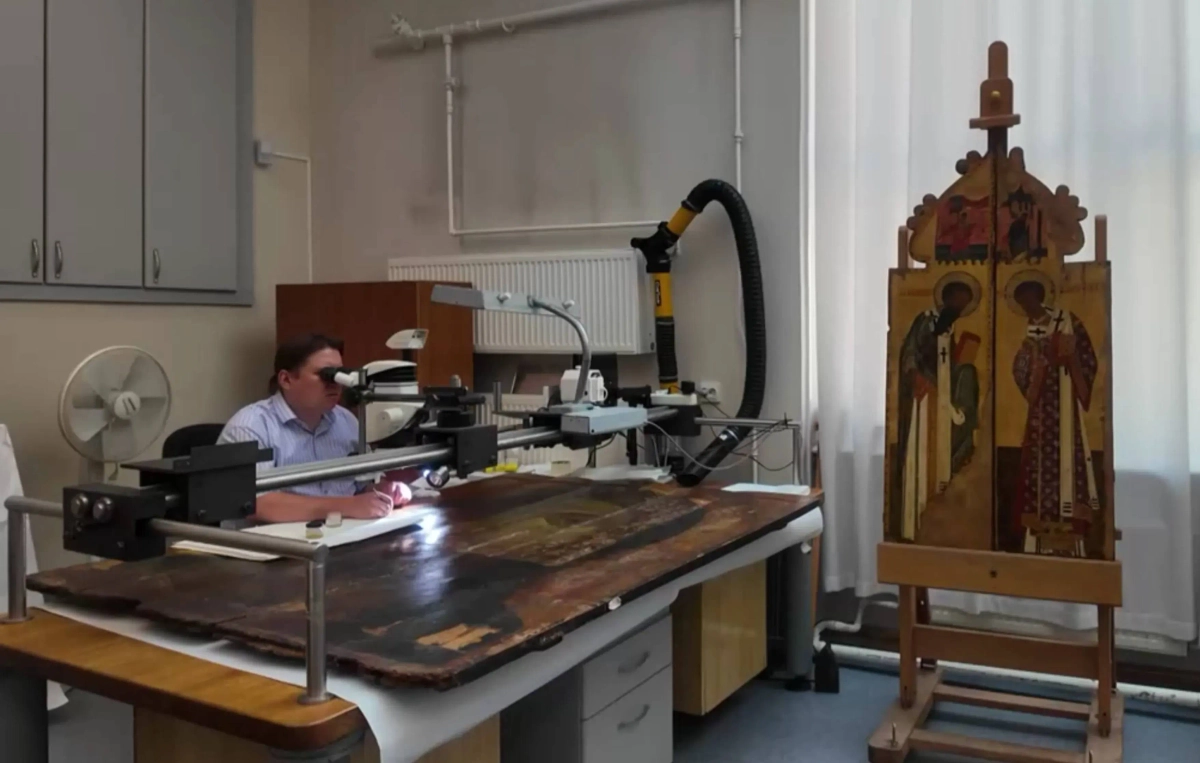 Петербургские реставраторы восстановили икону XVI века. Видео © Телеканал «Санкт-Петербург»