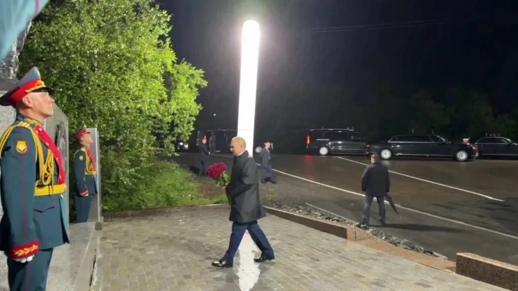 Путин под дождём возложил 20 алых роз к мемориалу героям Алсиба в Магадане
