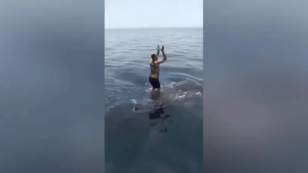 В Иране мужчина запрыгнул на огромную акулу и попытался прокатиться