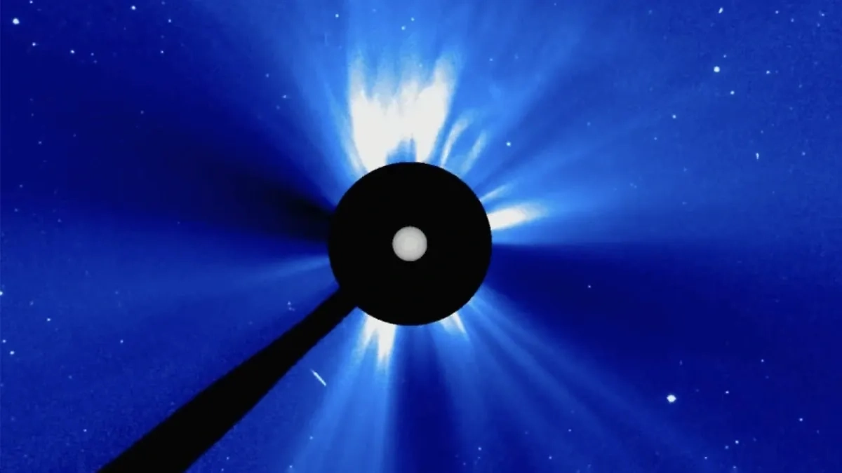 На кадрах видно, как на фоне звезды вспыхивает яркая вспышка — результат колоссального выброса плазмы. По данным лаборатории, перед этим произошли два меньших по мощности выброса в северном направлении, а затем — резкий всплеск активности.
