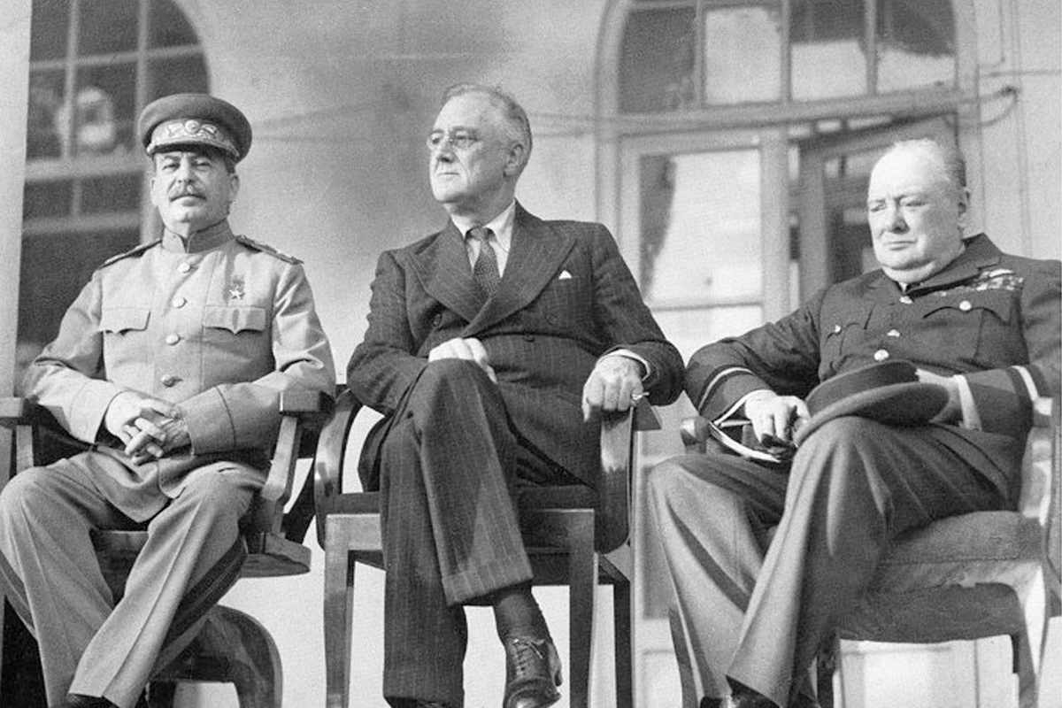 И. В. Сталин, Ф. Рузвельт У. Черчилль в Тегеране. Обложка © Общественное достояние