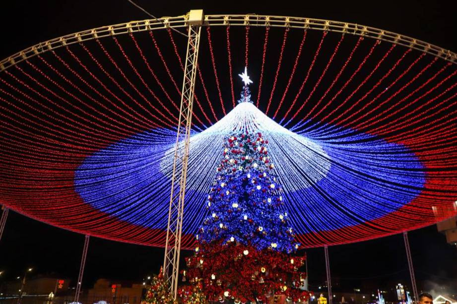 «Ёлка и шатёр представляют собой целые медиаэкраны — каждый их пиксель управлялся специальной программой, в которой можно задавать не только различные алгоритмы изменение цвета и скорости мигания ламп, но и создавать различные надписи», — говорится в сообщении.