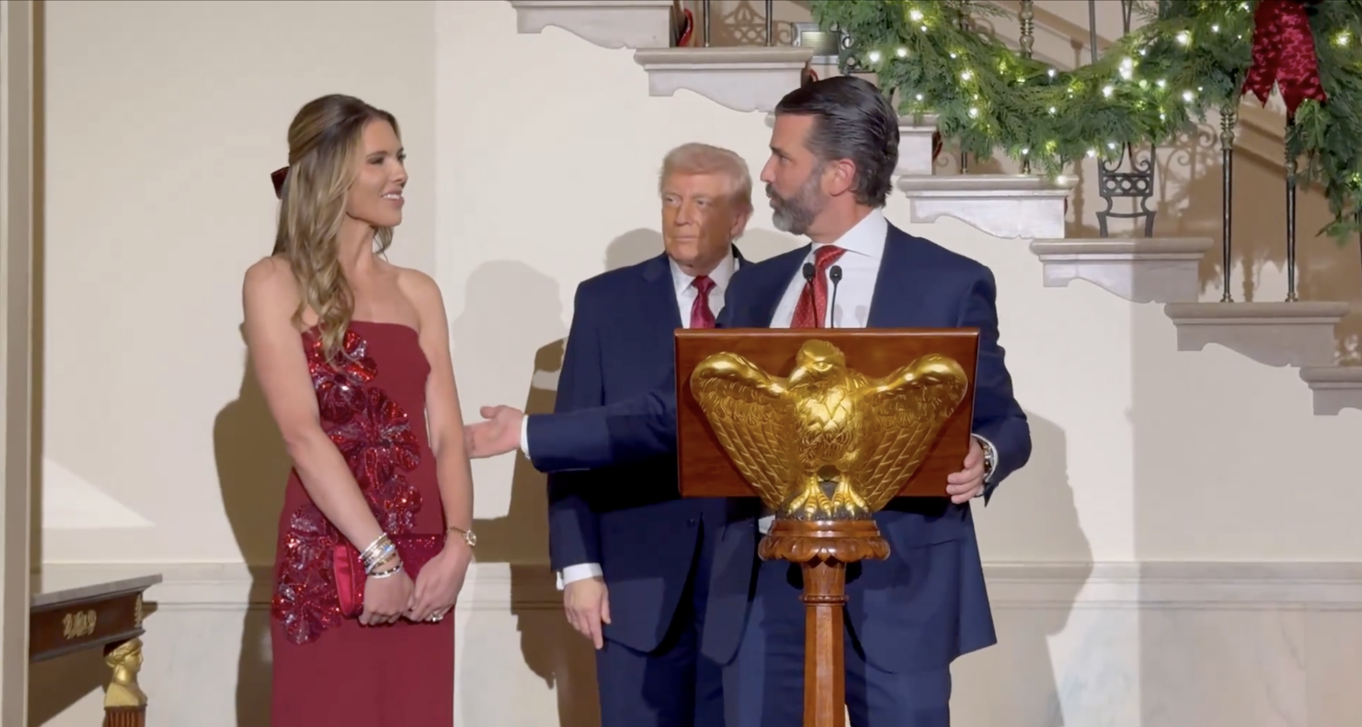 Сын президента США Дональд Трамп-Младший объявил о помолвке с моделью Беттиной Андерсон. Он поделился радостной новостью в Белом доме, фрагмент публикует журналистка Лора Лумер в соцсети X.