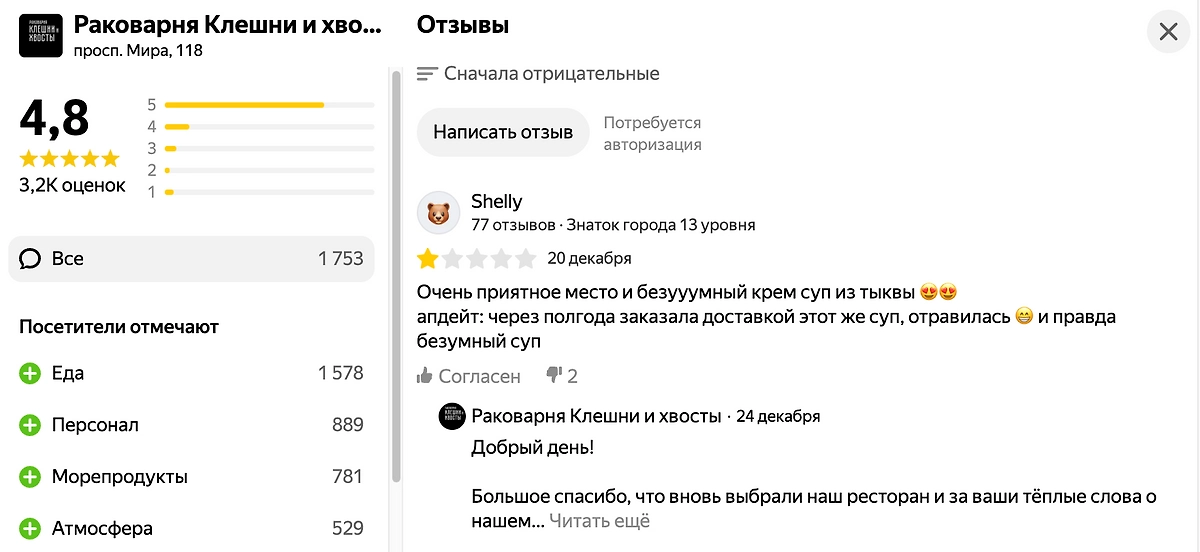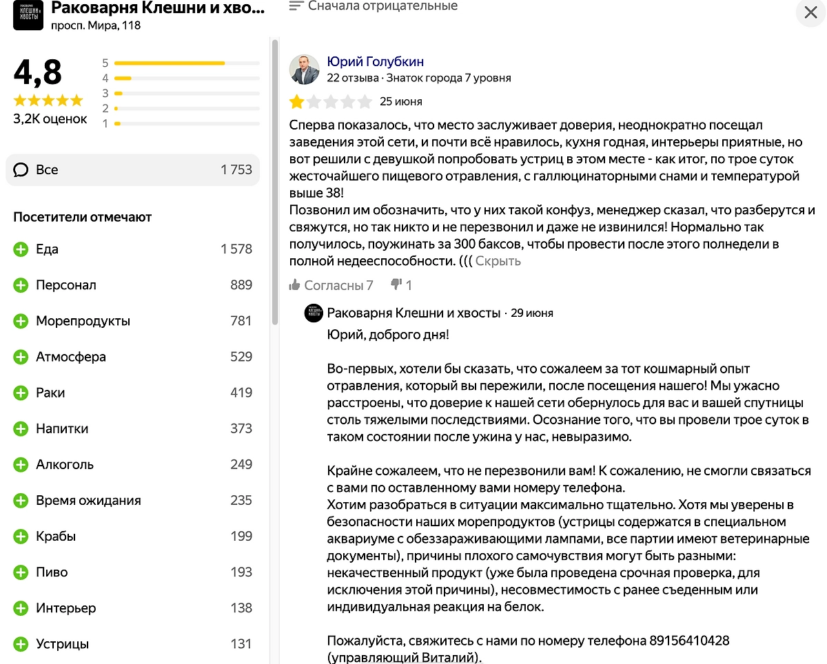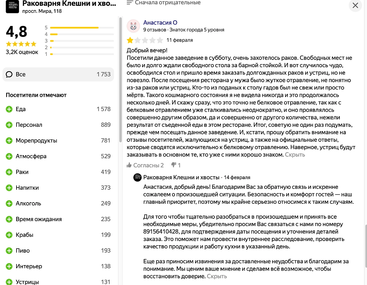 Однако предлагают посетителям связаться с рестораном, чтобы в индивидуальном порядке решить вопрос. Цинизм заключается в том, что менеджеры «Клешней и хвостов» желают отравившимся скорейшего выздоровления. Жалоб на отравления меньше не становится. Новые отравившиеся, как и Андрей, делают в отзывах приписку, мол, едим устрицы далеко не в первый раз и прежде никакого белкового отравления не было.