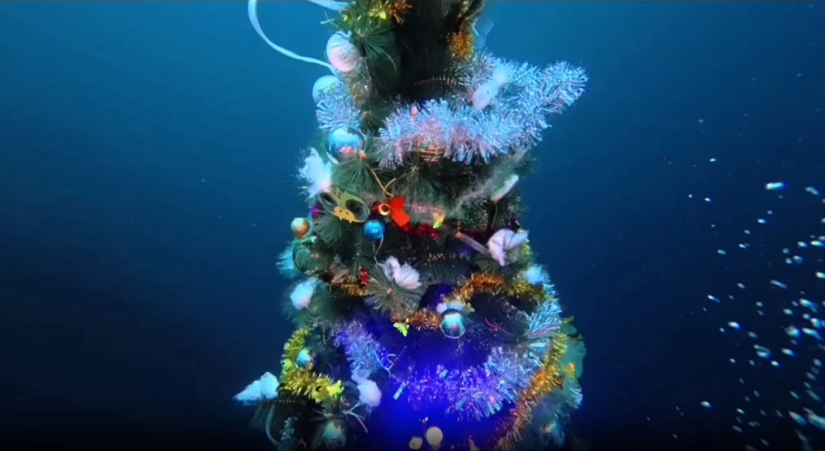 Этой бодрой традиции уже более 40 лет. В этот раз живую ёлку установили недалеко от берега на небольшой глубине — всего 11 метров. Украсили её не только традиционными игрушками и мишурой, но и местной фауной: миниатюрными рачками-гаммарусами, которые облепили ветви.
