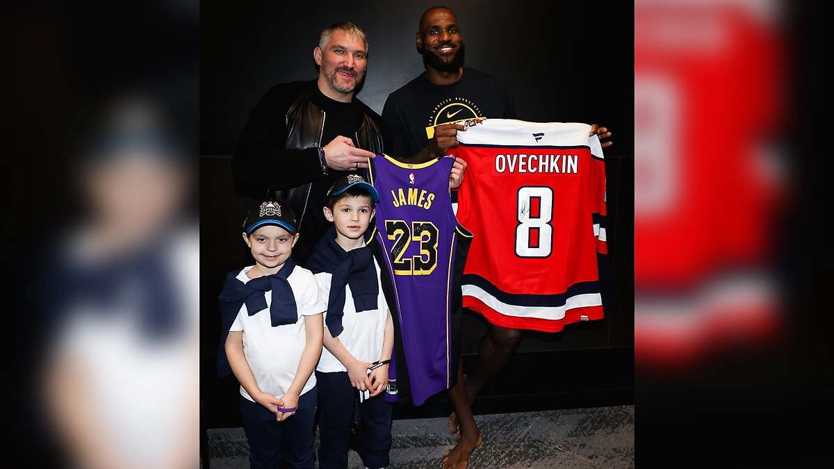 Хоккеист сделал совместное фото с баскетболистом и своими детьми, а затем обменялся с ним памятными подарками. Овечкин вручил Джеймсу свою игровую футболку, а в ответ получил именную майку «Лейкерс».