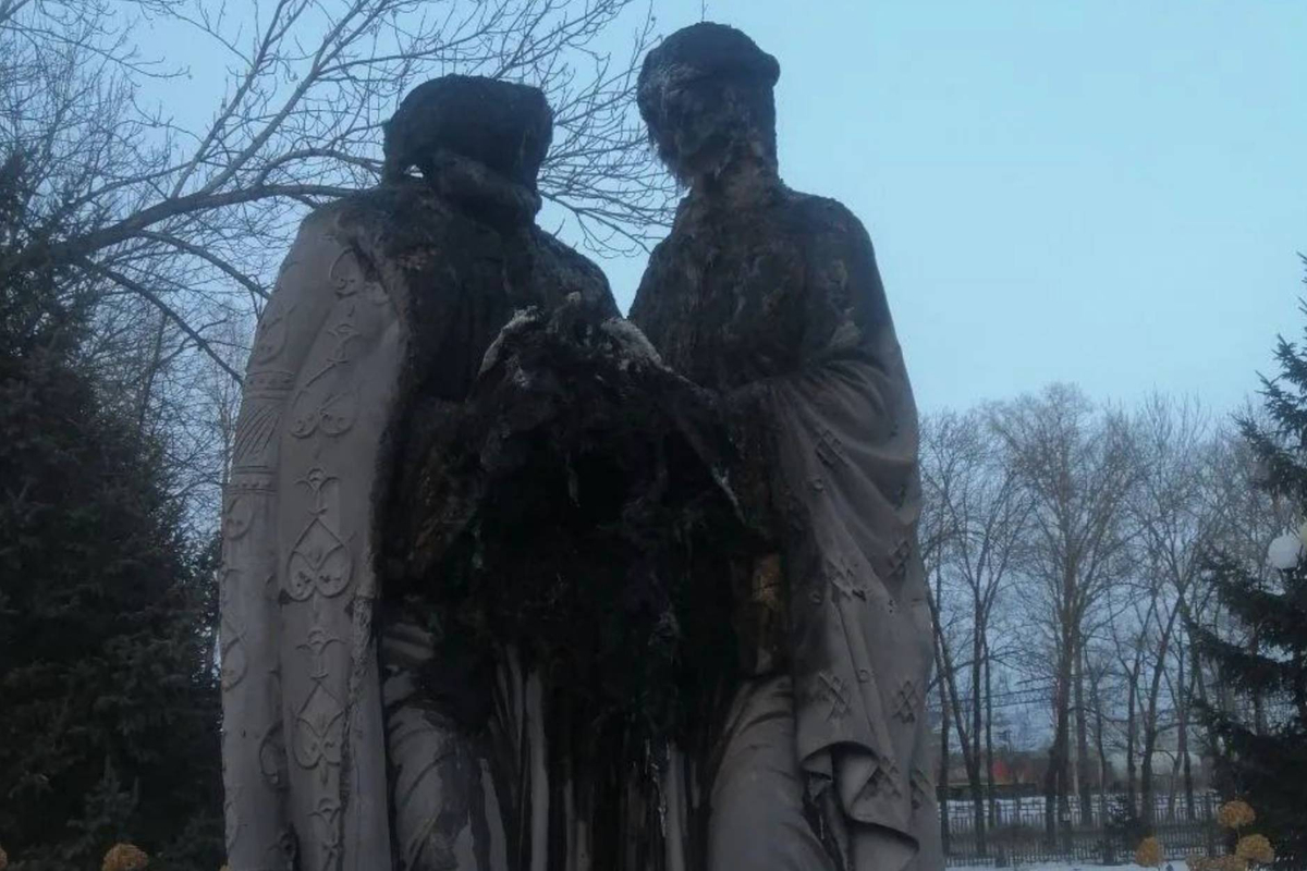 В Биробиджане сожгли памятник Петру и Февронии в преддверии 14 февраля. Обложка © Telegram / МАРИЯ КОСТЮК