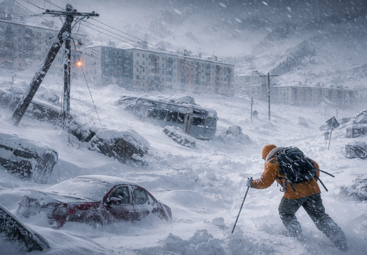 Анадырь накрыла сильнейшая пурга: по данным местных властей и сообщений СМИ, порывы ветра достигают 40 м/с. Из-за метели и заносов в городе резко осложнилось движение — дороги и тротуары заметает так, что технике сложно пройти, а людям приходится буквально «держаться маршрута» от одного укрытия к другому.