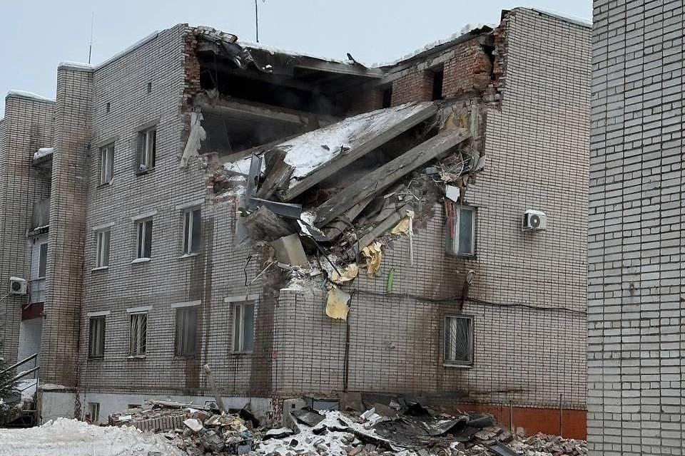 На кадрах с места ЧП видно здание с обрушившимися вторым и третьим этажами. Угроза дальнейшего обрушения здания сохраняется. На месте работают экстренные службы.