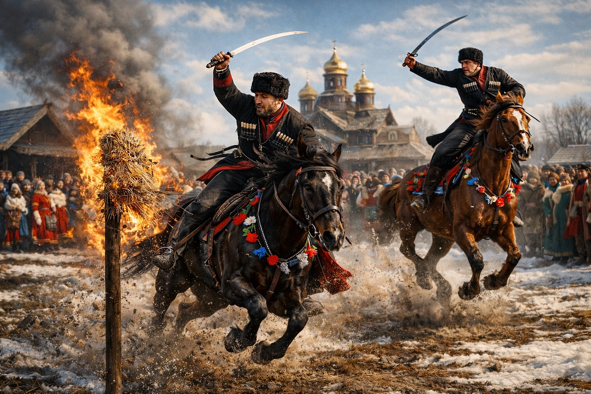 Казачья Масленица: скачки, джигитовка и военные состязания на празднике. Фото © Nano Banana AI