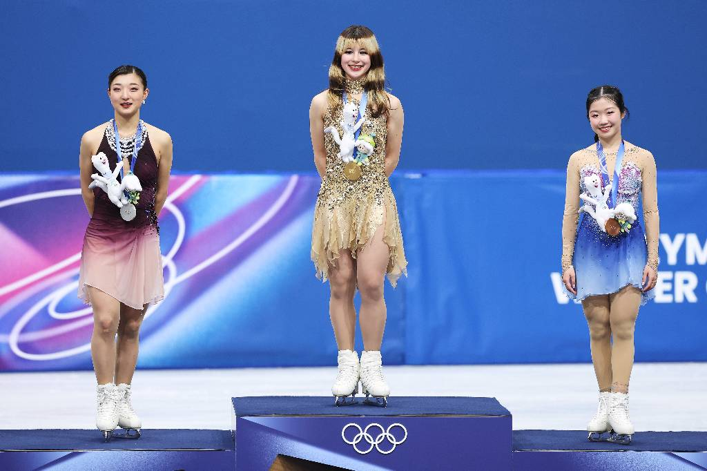Слева направо: Каори Сакамото (Япония, серебро), Алиса Лю (США, золото) и Ами Накаи (Япония, бронза). Обложка © ТАСС / VCG / Tang Xinyu