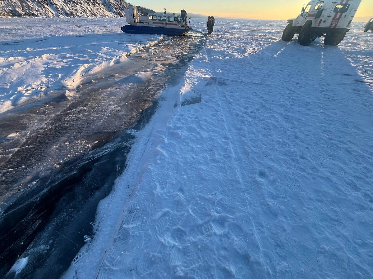 На свежем фото МВД с места трагедии виден участок льда Байкала с проломом и следы техники, а также стоящие поблизости автомобили.
