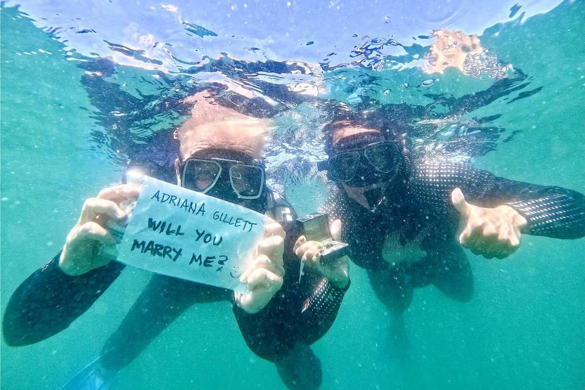 На опубликованном фото пара запечатлена в масках для подводного плавания в окружении китовых акул. Хэтфилд держит плакат с надписью: «Адриана Джиллетт, ты выйдешь за меня замуж?», а Джиллетт показывает большой палец вверх. Женщина также поделилась этим снимком на своей странице.