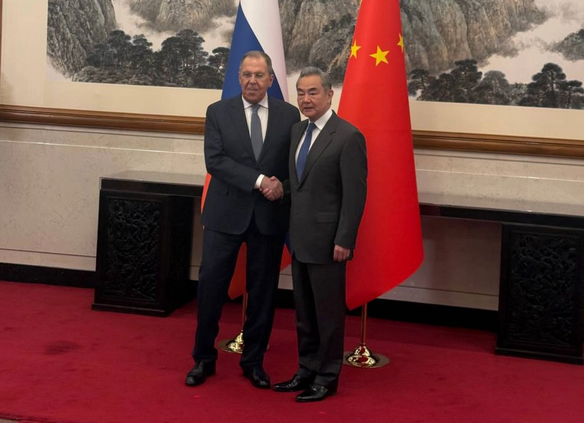 Министр иностранных дел России Сергей Лавров встретился в Пекине со своим китайским коллегой Ван И. Официальный представитель МИД РФ Мария Захарова показала в телеграм-канале совместное фото дипломатов во время их общения.