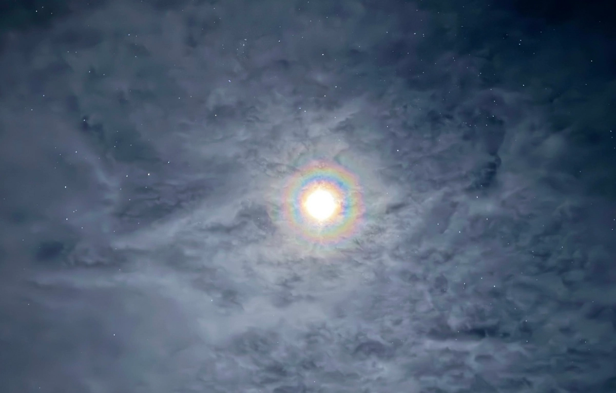 «Венец возникает тогда, когда перед светилом появляется тонкий слой облаков или туман, состоящий из мелких капель воды или ледяных кристалликов. Они становятся препятствиями для света, из-за чего лучи дифрагируют – то есть огибают эти частицы, «рисуя» на небе венец» , – пояснили учёные.
