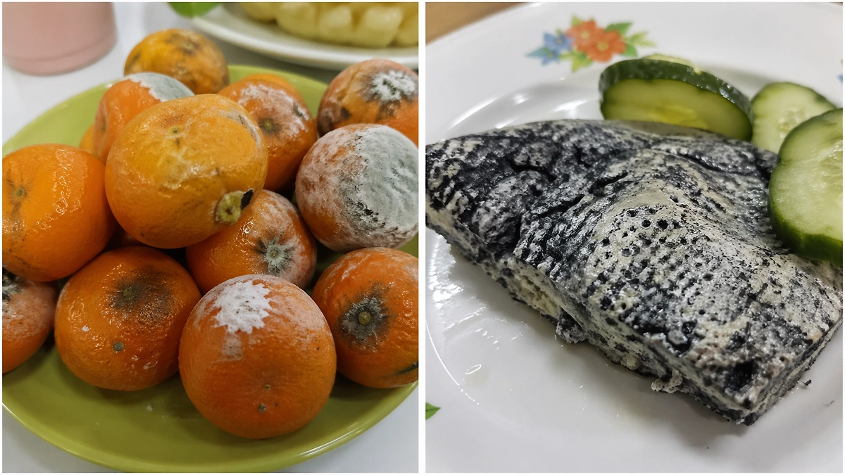 В публикации также приводятся фото, на которых запечатлены блюда ненадлежащего качества, включая омлет с изменённым цветом и фрукты с признаками порчи. Отдельно утверждается, что на кухне фиксировались антисанитарные условия, включая загрязнённые поверхности и наличие насекомых.